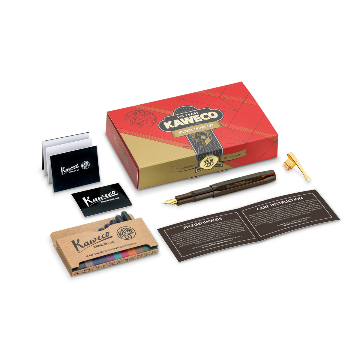 As a perfect addition, the limited set includes a nostalgic clip in gold for securely attaching the pen to the desk pad.?In addition to the standard royal blue ink cartridge in the fountain pen, the practical 10-pack contains all Kaweco ink colors for personalizing your own font.?Everything is wrapped in packaging inspired by cardboard boxes from over a hundred years ago.